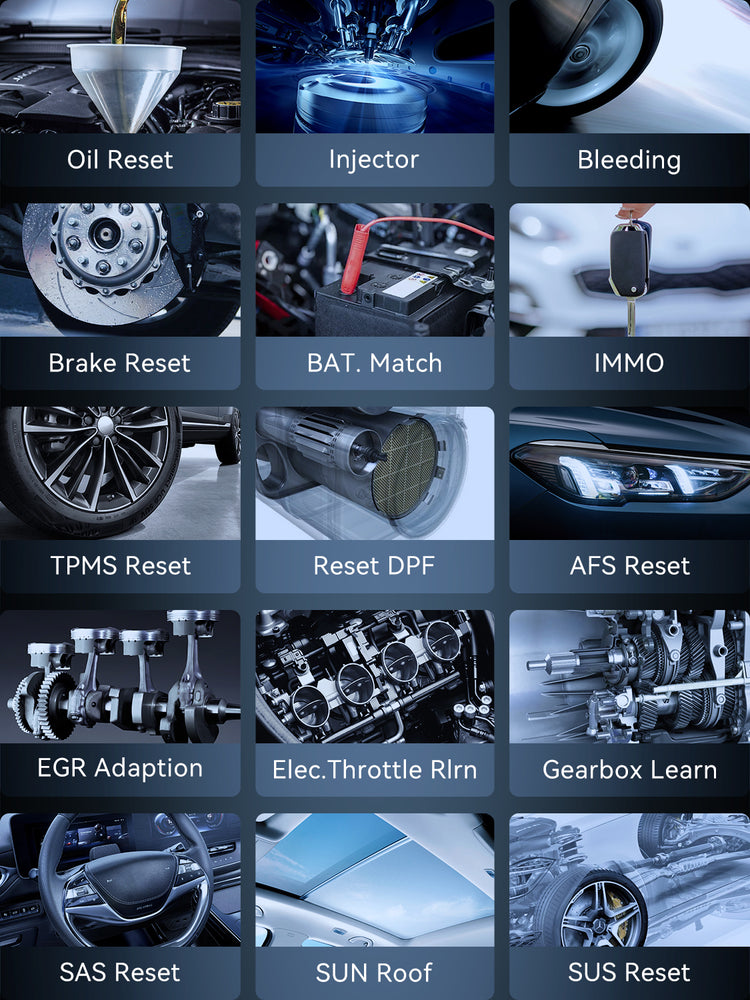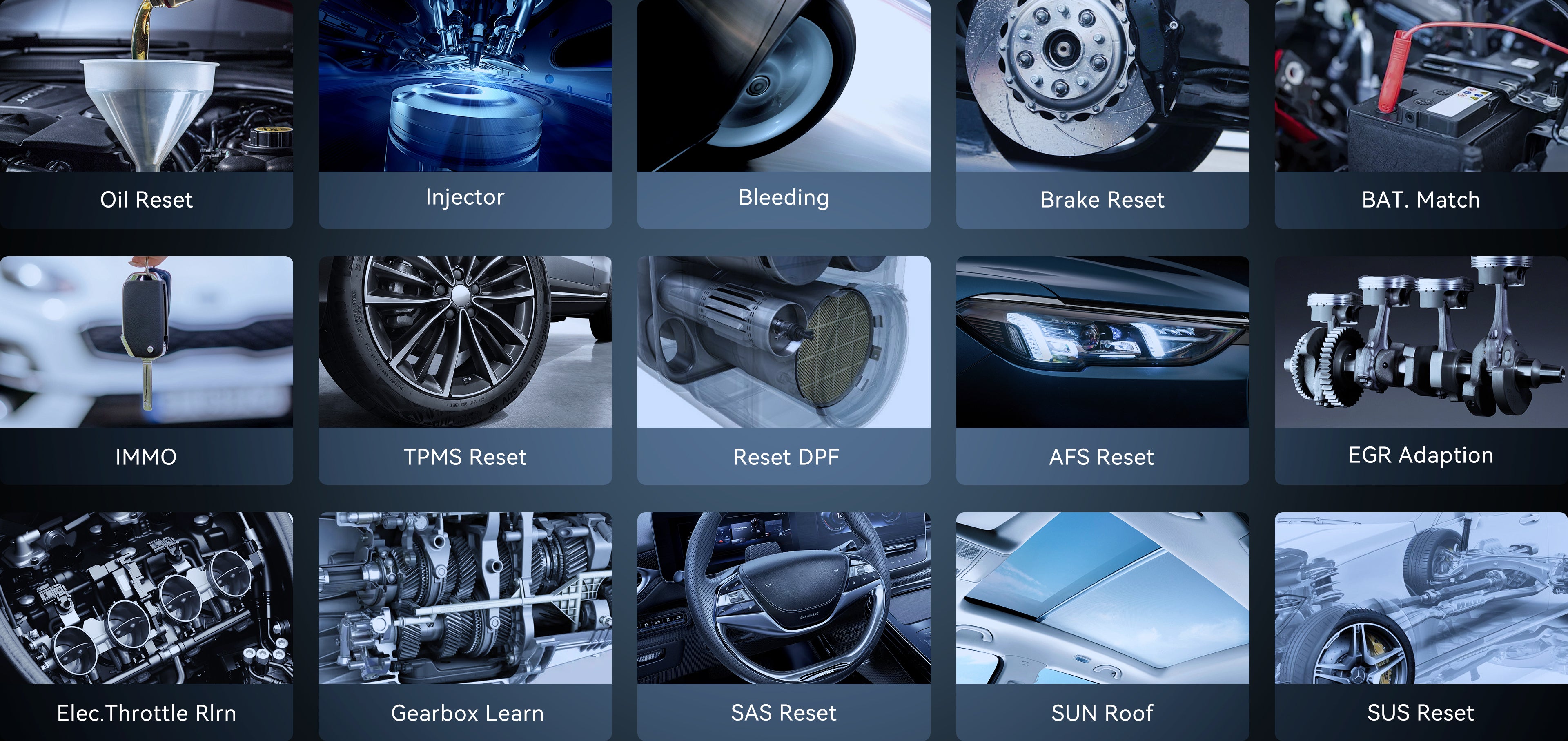 MUCAR BT200 MAX helps you to unlock 15+ critical vehicle maintenance reset functions engineered for workshop efficiency and precision repairs: Injector, EGR Adaption, AFS Reset, Elec.Throttle Rlrn, Oil Reset, SAS Reset, SUN Roof, BAT. Match, SUS Reset, Bleeding, Reset DPF, Brake Reset, Gearbox Learn, IMMO, TPMS Reset