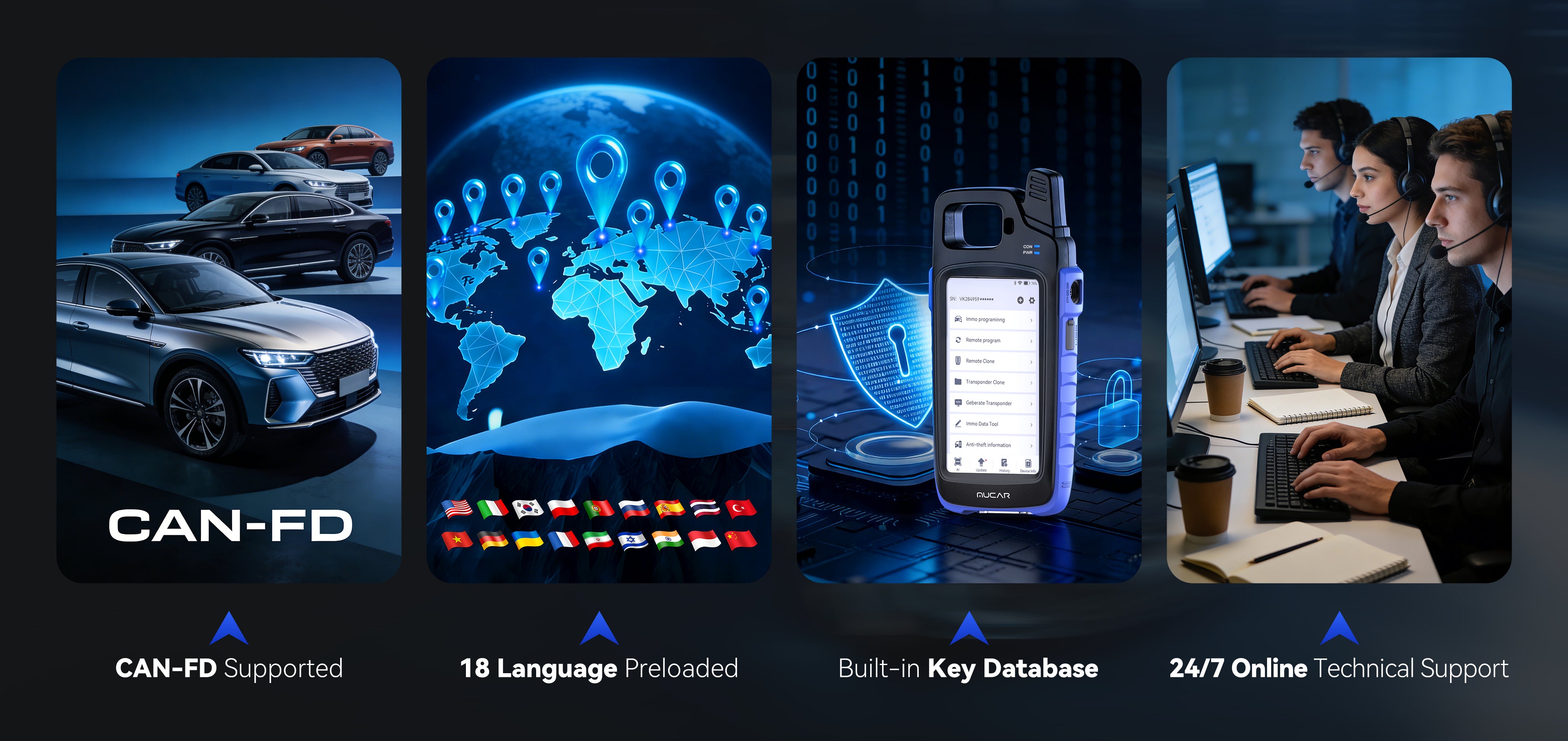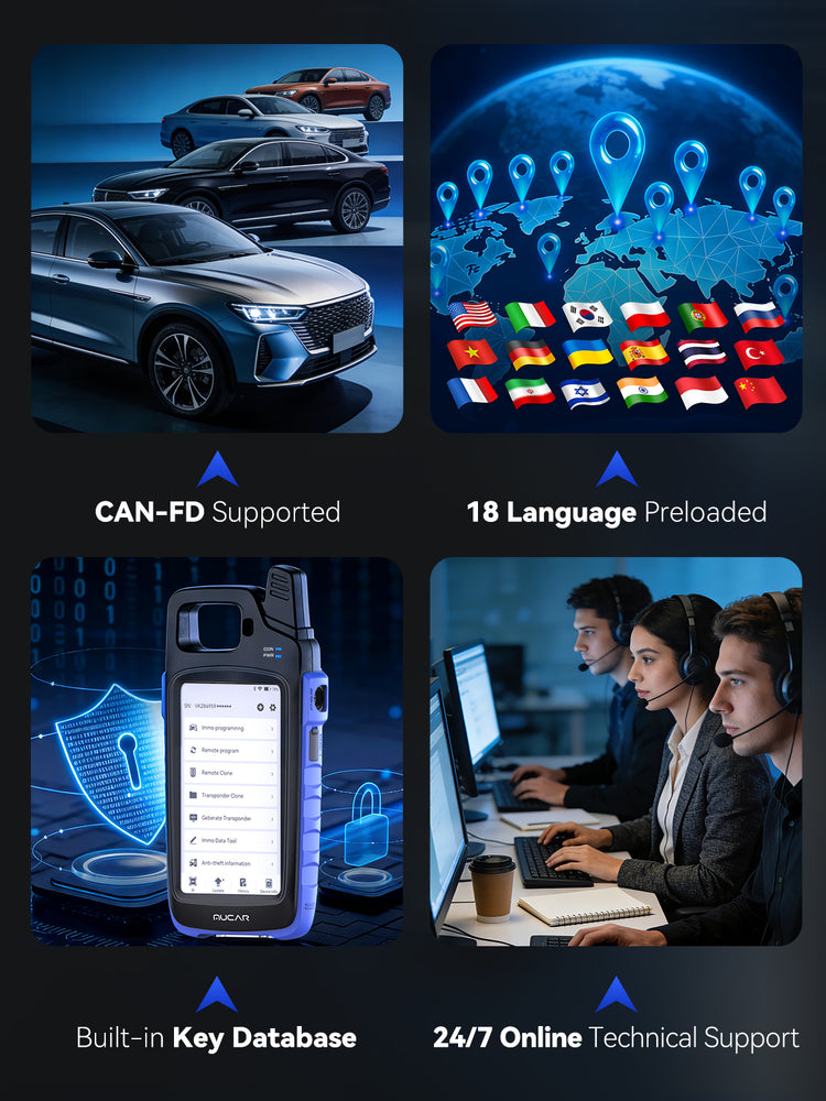 To ensure a powerful, convenient, and fully supported experience, MUCAR KEY581 offers CAN-FD support for the GM group, an intuitive 18-language interface, a built-in key database for quick reference, and the assurance of 24/7 online technical support.